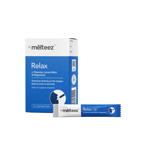 Relax naturally and gently with Melteez Relax, a convenient, sugar-free powder stick designed to support calmness, reduce stress, and improve sleep quality.