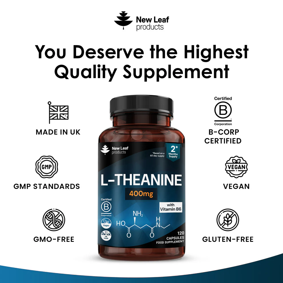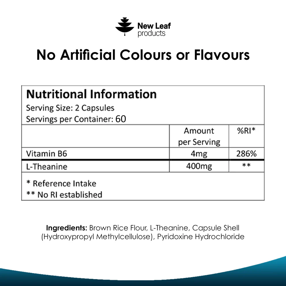 L-Theanine Capsules (120) is a dietary supplement containing L-theanine, a naturally occurring amino acid found in tea leaves, enriched with vitamin B6. It is designed to support calmness, relaxation, and mental focus without causing drowsiness. Vitamin B6 contributes to normal psychological function and helps the body use amino acids effectively. The product is typically taken as two capsules daily, providing about a two-month supply, and is vegan-friendly and free from artificial additives. It is intended for adult use as part of a balanced lifestyle.