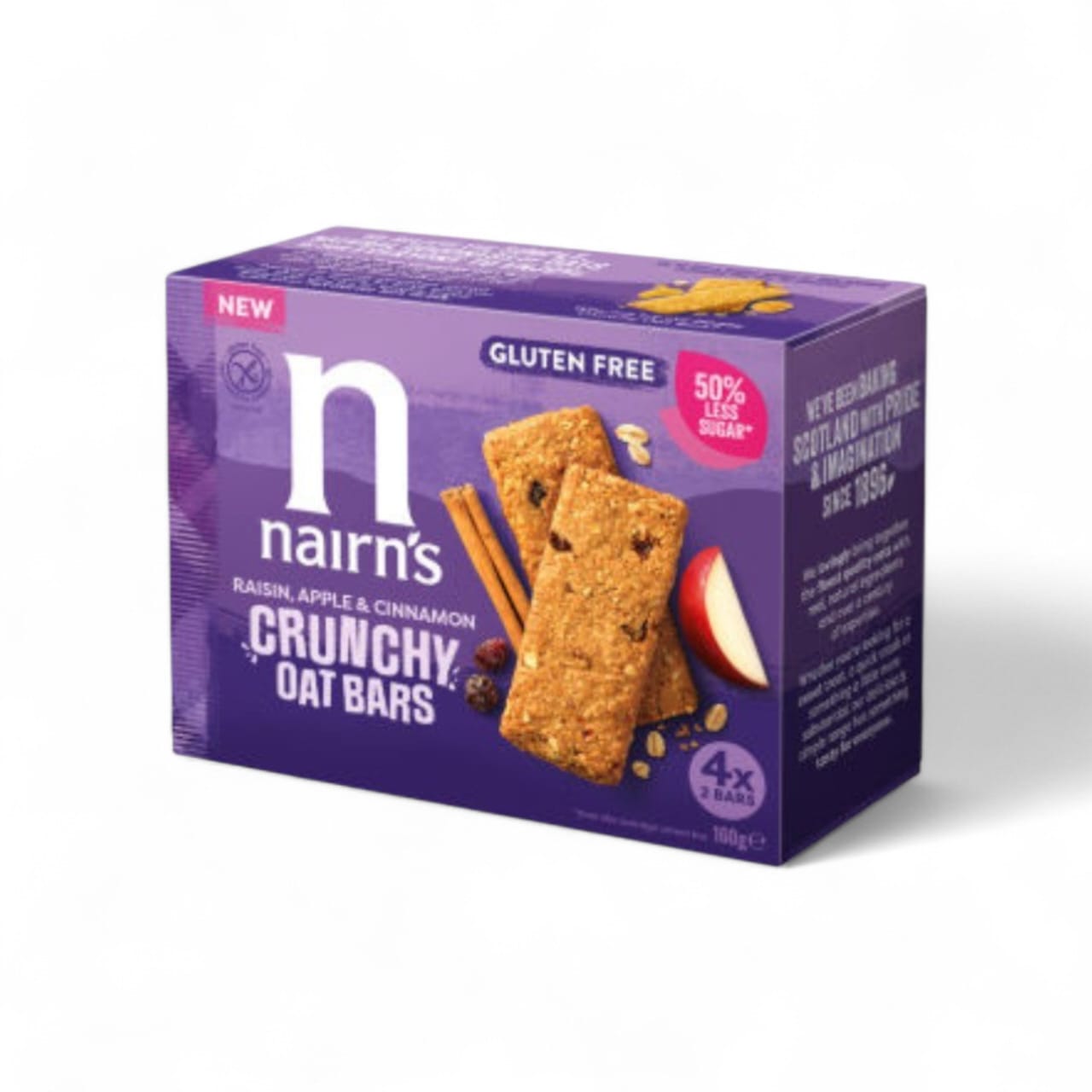 Nairn’s oat products originate from Scotland, where the company became well known for producing oat-based snacks using simple, natural ingredients. Over time, the range expanded to include gluten-free oat bars like the Raisin Apple & Cinnamon flavour, designed to provide a healthier alternative to traditional sugary cereal bars.