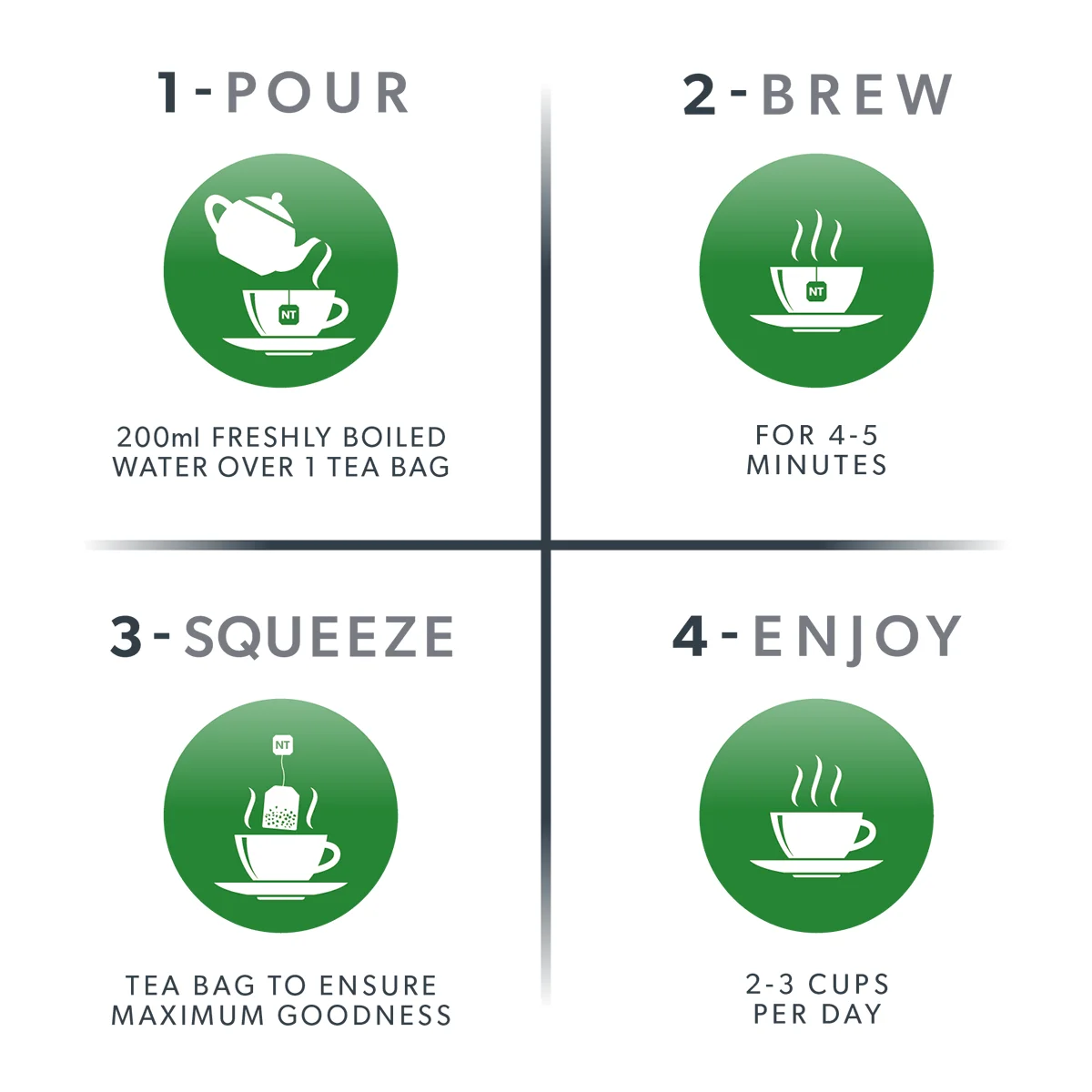 - Steep one sachet in hot (not boiling) water for 5–7 minutes.