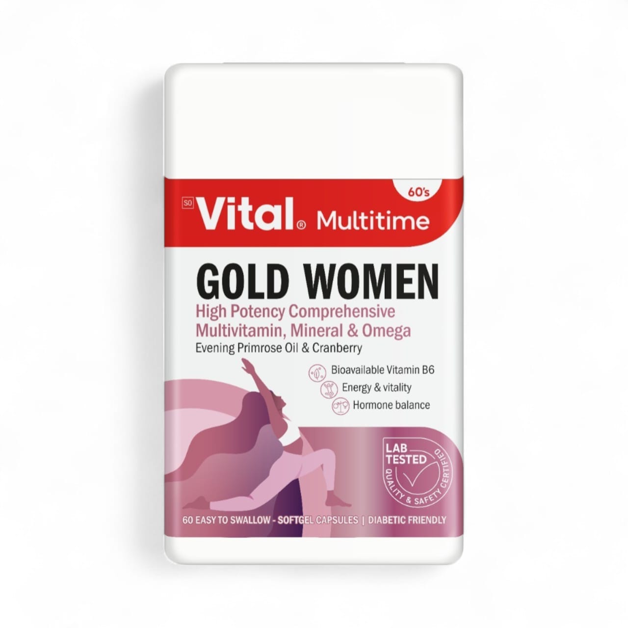 Vital Gold Women 60 Capsules is a comprehensive multivitamin, mineral and omega formulation designed specifically to support women’s overall health and vitality. It includes cranberry and evening primrose oil alongside essential vitamins and minerals to help maintain normal hormonal activity, promote healthy hair, skin and nails, and support strong bones and teeth. It also contributes to normal cognitive function, mental performance, and energy metabolism to help reduce tiredness and fatigue in daily life.